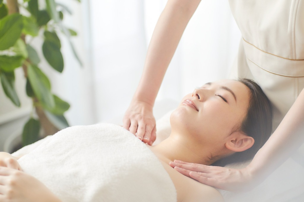 背中全体からデコルテ、お顔までゆっくり丁寧にリンパマッサージを致します。更に顔筋マッサージを施します。